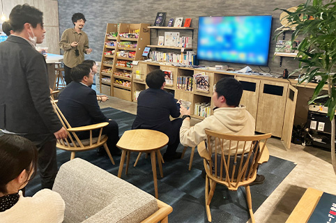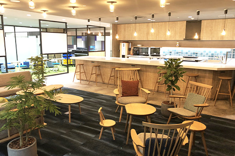 - サンシャインシティグループのコミュニケーションを活性化させる共用エリアです。大人数に向けたプレゼンテーションや、キッチンスペースでのカフェ休憩、夜はお酒を飲みながらの懇親会や、eスポーツ大会なども行われています。